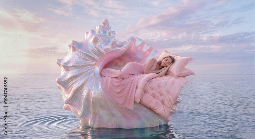 Serene illustration of a woman in a state of deep relaxation and meditation, nestled within a giant iridescent pink seashell bed floating on a calm, misty ocean with graceful dolphins. #1941746552
