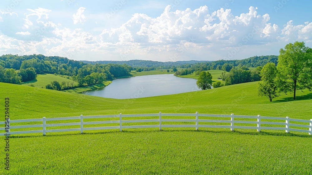 Serene lake view, rolling hills, green pasture, summer day, idyllic landscape, perfect for real estate #1254294003