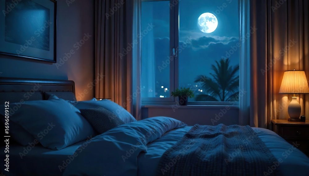 Serene night scene with soft, diffused moonlight illuminating a tranquil bedroom, featuring a plush bed with pillows and blankets, suggesting peaceful sleep , bedroom, moonlight, tranquil #1696019152