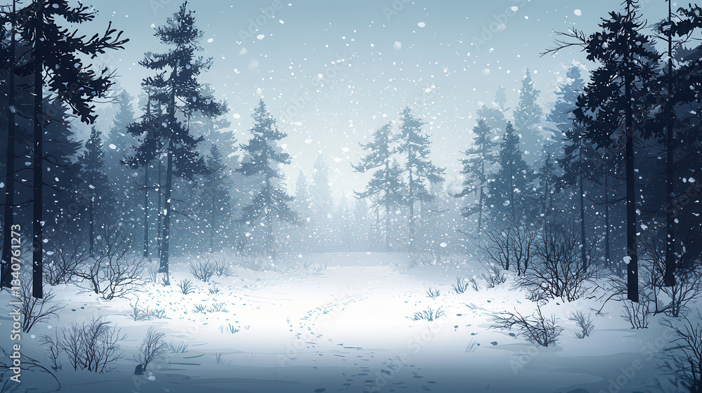 serene snowstorm blankets dense pine forest, with snow covered ground and scattered footprints leading into misty distance #1340761273