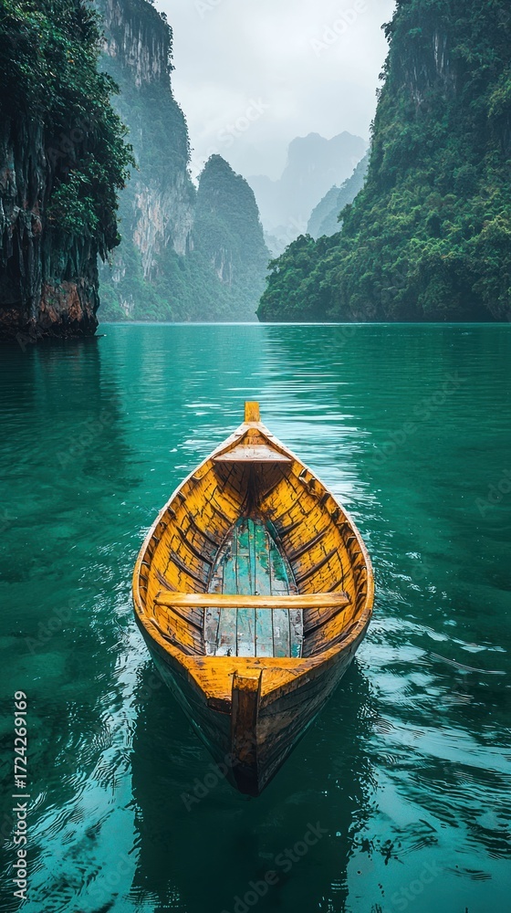 Serene Solo Boat Journey Through Emerald Lake, Majestic Mountains #1724269169