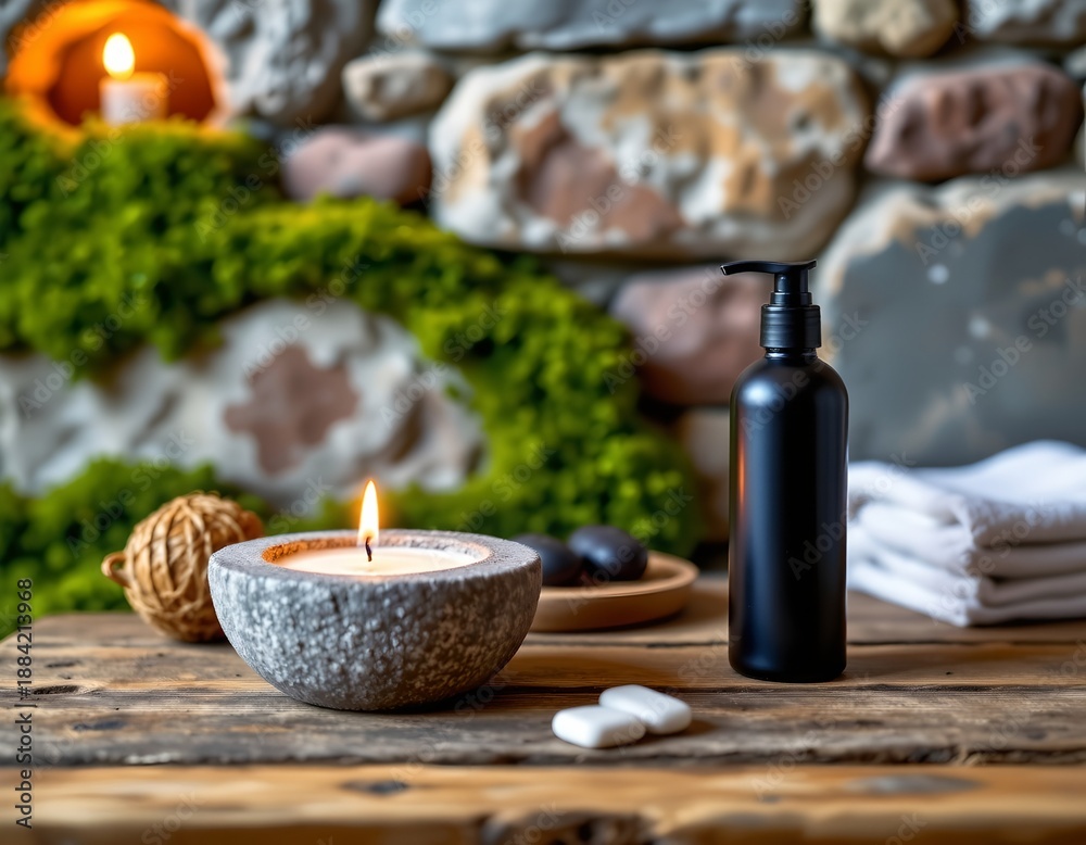 Serene Spa Scene with Candle Wellness Bottle and Rustic Ambiance #1884213968