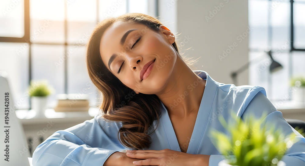Serene woman relaxing at desk with eyes closed. #1943142818