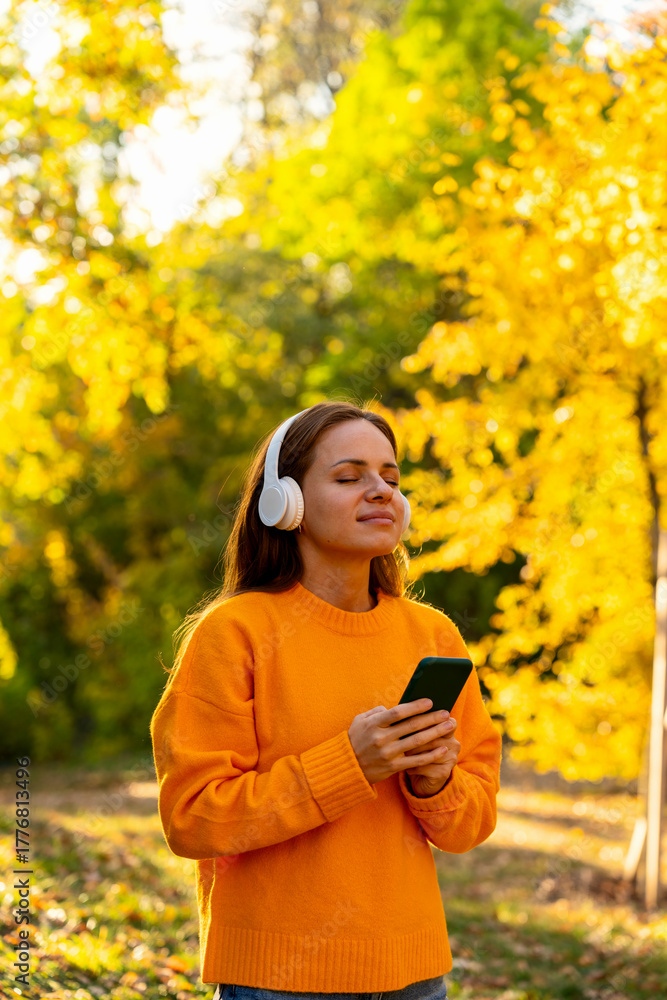 Serene woman using smartphone with wireless headphones in sunny autumn park outdoors #1776813496