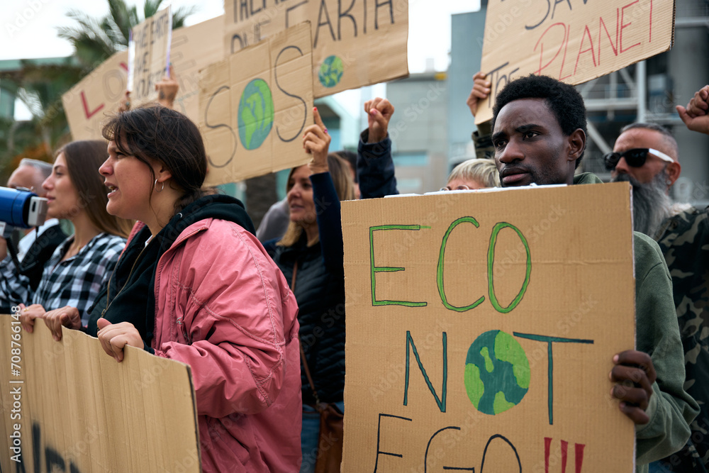 Serious African man holding a banner in a demonstration. Group of people at manifestation on climate change and global warming pollution and factories, environmentalists involved in the fight against #708766148