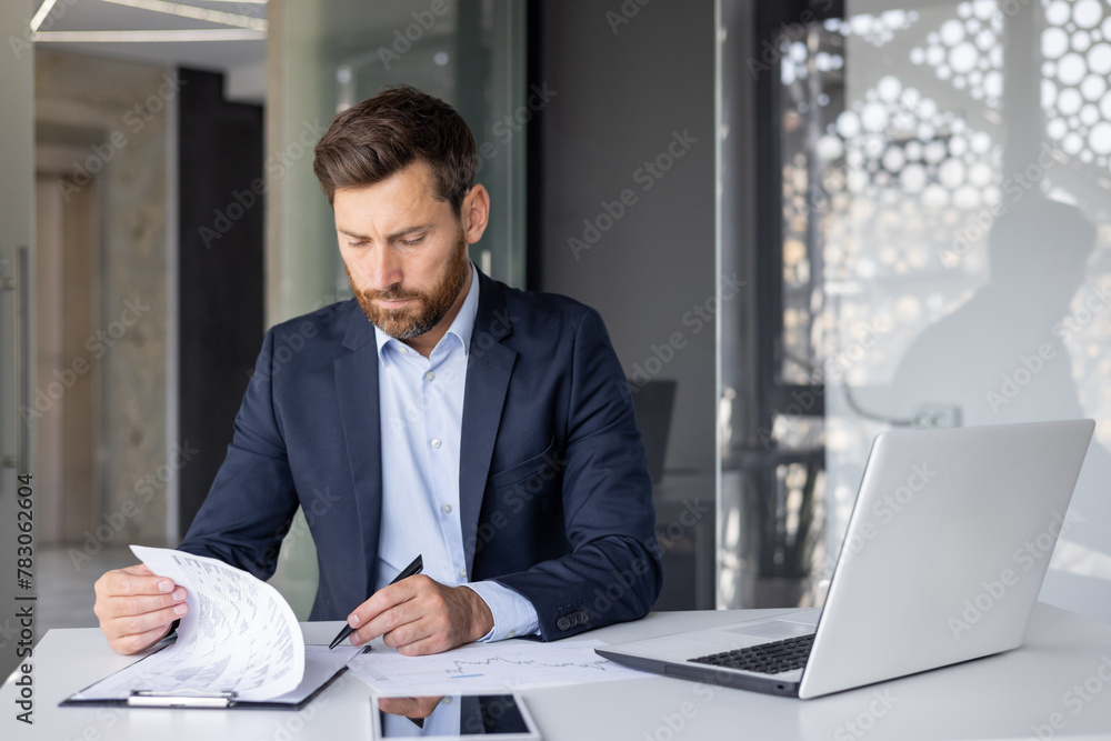 Serious young man businessman, company owner and executive director working at desk in office with documents, signing invoices and agreement #783062604