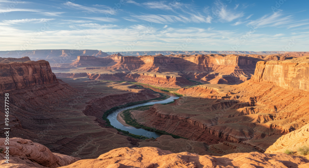 Serpentine river carving through layered sandstone cliffs, desert canyon landscape, natural wonder, Arizona wilderness, sunlit vista. #1946577758