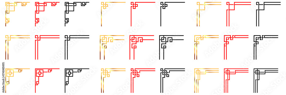 Set Asian style decorative corner frames in gold, red, and black. Vector design with geometric, traditional patterns. Perfect for invitations, borders, or ornamental art in Asian themes. #1740481495