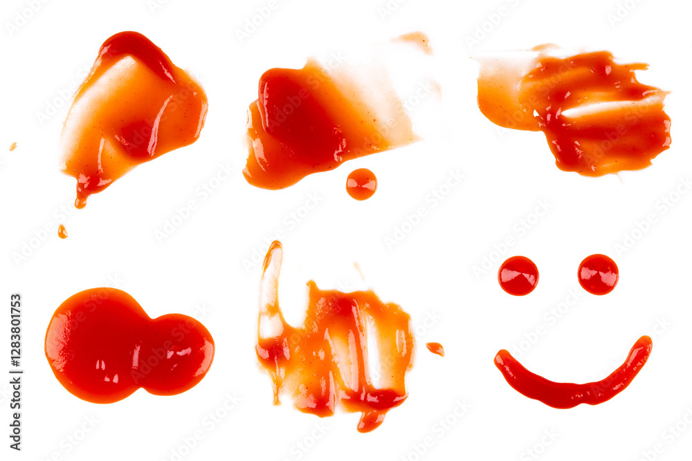 Set ketchup splashes, stains isolated on white, tomato pure texture #1283801753