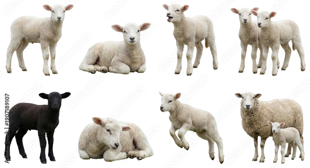 set of a lamb in different poses, standing, sitting, lying isolated on a transparent background #1907189107