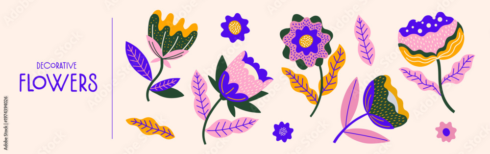 Set of abstract decorative flowers and leaves on beige background. Flat vector illustration with floral elements. Springtime holidays. Design for banner, greeting card, invitation, postcard. #1974394026