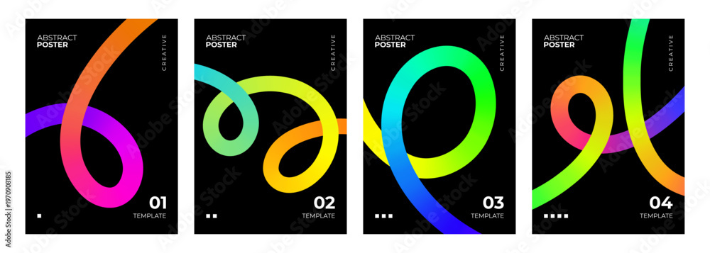Set of abstract posters. Vibrant color gradient curved thick flowing lines on black background. Vector illustration. #1970908185