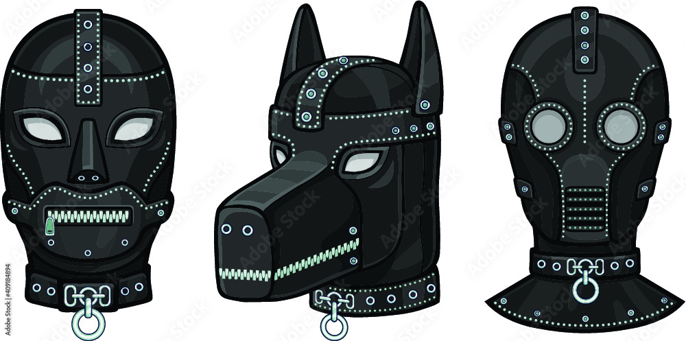 Set of animation leather masks for adults. Template for erotic content. Vector illustration isolated on a white background. Print, poster, t-shirt, card, emblem. #409184894