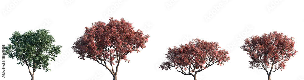 Set of autumn and summer Cotinus coggygria (the European smoketree, smoke tree, smoke bush) frontal street trees isolated png in sunny daylight on a transparent background perfectly cutout #1886699598
