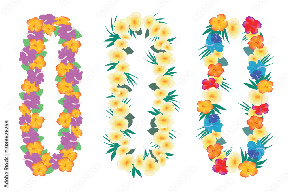 Set of beautiful tropical flower necklaces in cartoon style. Vector illustration of traditional bright necklaces of plumeria, hibiscus, green leaves isolated on white background. Hawaiian jewelry. #1089826254