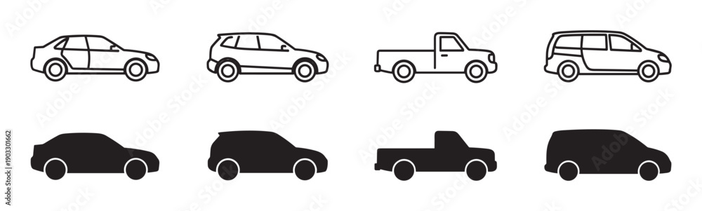 Set of black car vector icons showing different vehicle types like sedan, SUV, pickup truck, and minivan in both line art and solid silhouette styles from a side view #1903301662