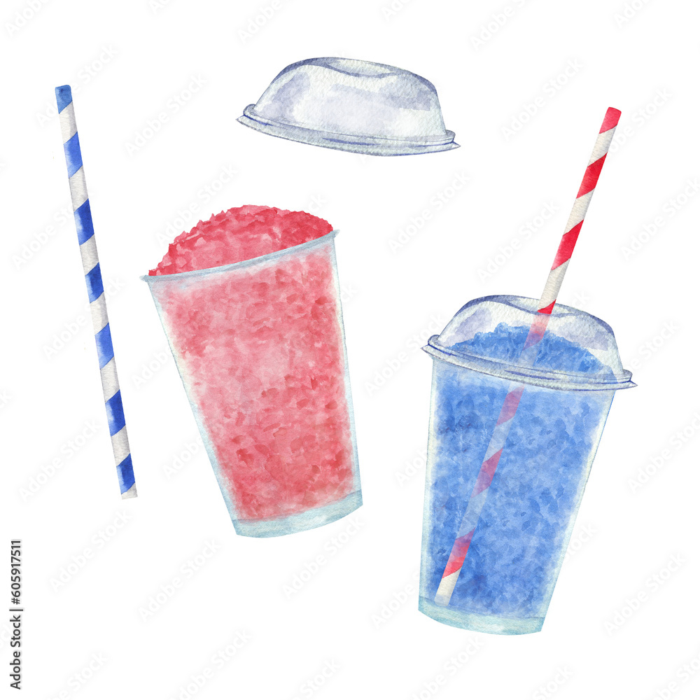 Set of blue and red summer slushies in plastic cup with straw. Watercolor illustration isolation on transparent. #605917511