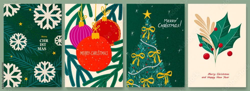 Set of Christmas and New Year 2026 art cards in a modern hand-drawn style. This vector collection features a Christmas tree, balls, leaves, and snowflakes for cover design, banners, and packaging. #1766127795