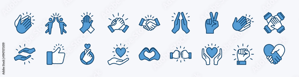 Set of clap and applause icon. Contains cheers hand, handshake, peace, thumbs up, love, care, passion, together, help, support, partnership, agreement, trust, cooperation, high five - vector #1947073019