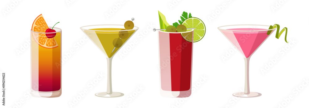 Set of classic cocktails isolated on white background. Alcohol drinks in tall glasses. Vector illustration of tequila sunrise, cosmopolitan, Martini and bloody Mary #896254622