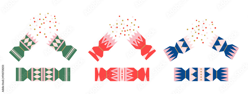 Set of colorful crackers with confetti on white background. Geometric flat ornament. Christmas or birthday template. Isolated elements. #1765728253