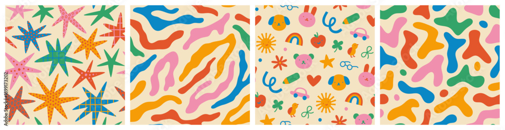 Set of colorful funny seamless pattern for children or maximalist background. Multi color creative hand drawn doodle toy texture, organic animal print illustration, celebration star design drawing. #1899173202