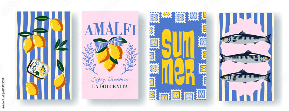Set of colorful italian posters summer: lemons, sardines, marine motifs, decorative tiles, and cheerful typography. Perfect for travel, kitchen decor, packaging, and prints #1439919095