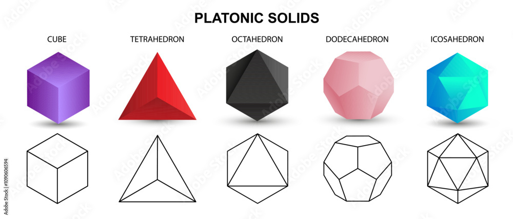 Set of colorful vector editable 3D platonic solids isolated on white background. Mathematical geometric figures such as cube, tetrahedron, octahedron, dodecahedron, icosahedron. Icon, logo, button. #1090606594
