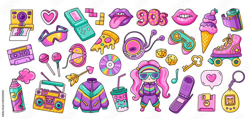 Set of cute retro colorful stickers. Fashion, music, game, tech, lifestyle. 90s style cartoon collection. Patch, badge, icon. Vector illustrations. #1651265064