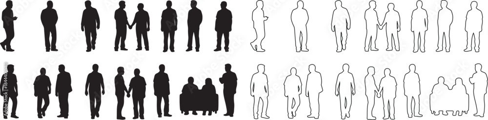 Set of Diverse People Silhouettes and Outline Figures. Black and White Vector Collection for Architectural Drawings and Urban Design. isolated PNG with Transparent Background #1844403580