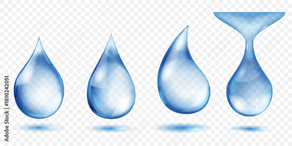 Set of drops of blue water, with detailed highlights and gradients for a 3D effect, set against a transparent background with subtle shadow reflections below. Transparency only in vector format. #1810242051
