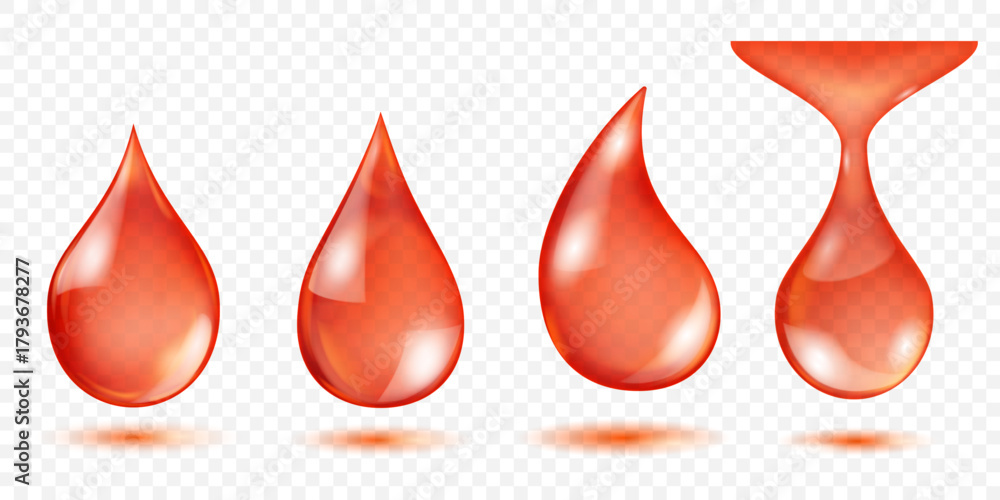 Set of drops of red water, with detailed highlights and gradients for a 3D effect, set against a transparent background with subtle shadow reflections below. Transparency only in vector format. #1793678277