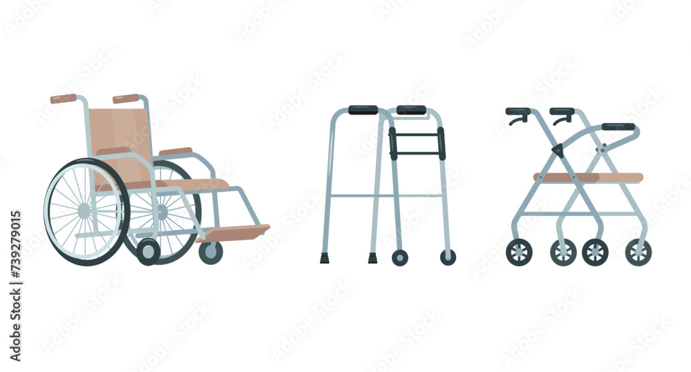 Set of equipment for people with disabilities or elderly and social adaptation. Wheelchair and Walkers. Medicine rehabilitation in clinic and hospital. Vector icons isolated on white background. #739279015