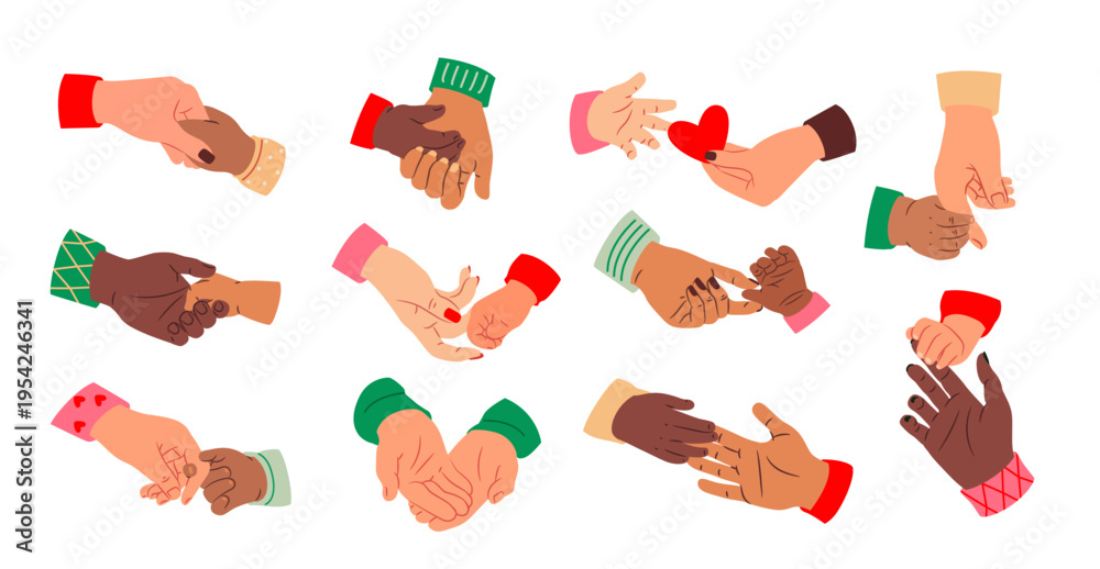 Set of family hands. Stickers with mothers and fathers hands reaching out to their children hands. Love and support of parents. Flat vector illustration collection isolated on background #1954246341
