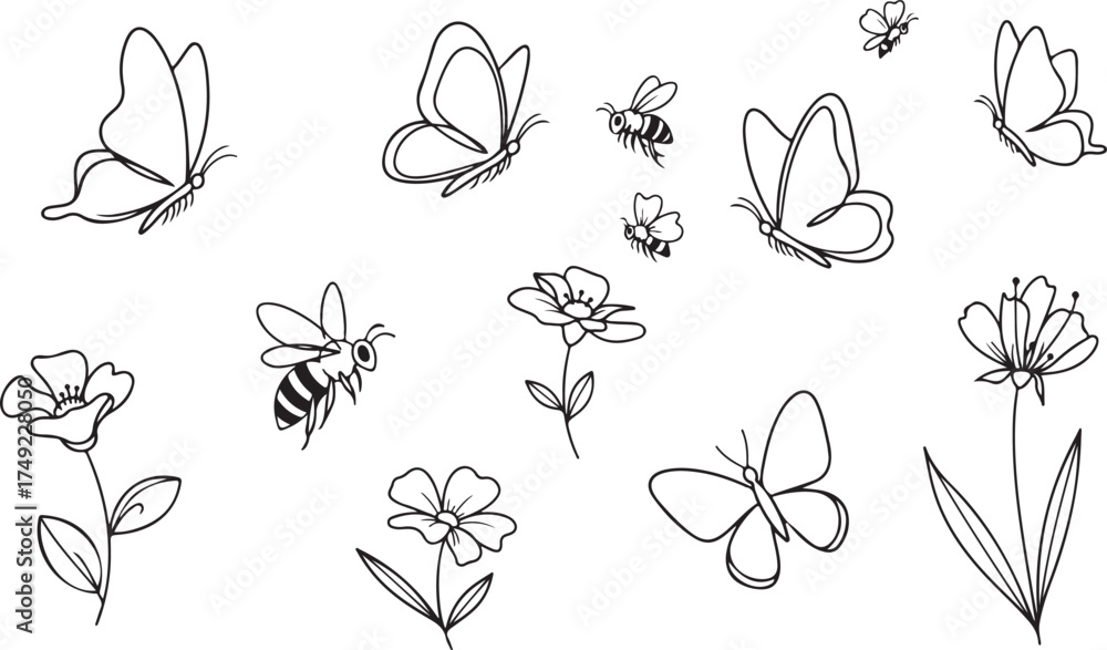 set of flowers Butterflies, Bees, and Flowers Line Art | Spring Insect Doodles VectorHand Drawn Pollinator Sketches | Simple Bugs and Flora Outline ClipartBlack and White Outline: Butterfly and Be #1749228050