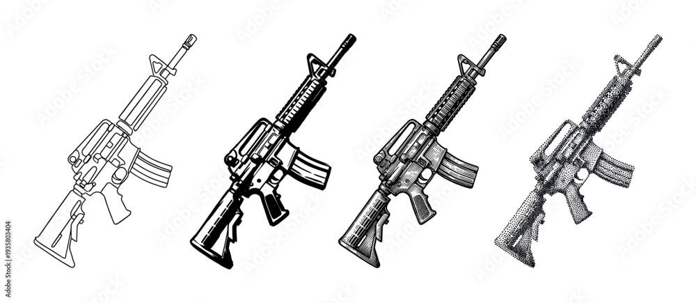 Set of four assault rifle illustrations showcasing various hand-drawn techniques like line art, solid ink, detailed hatching, and stippling dotwork for a graphic effect #1935803404
