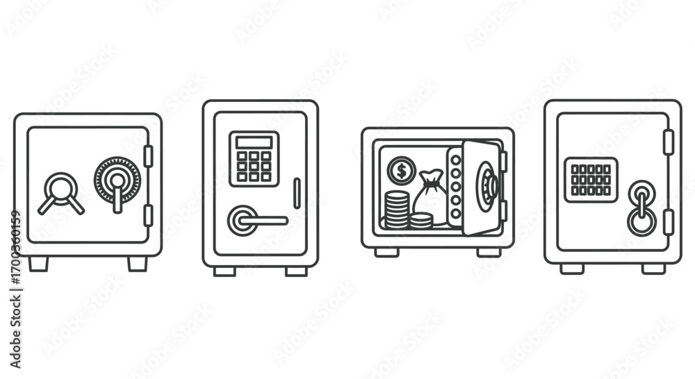 Set of four hand-drawn safes showing different security features and contents for valuables vector #1700360159