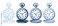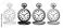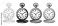 Set of four vintage pocket watches illustrated in various black and white graphic styles like line art, silhouette, engraving, and stippling, showing open lids and Roman numerals #1937412091