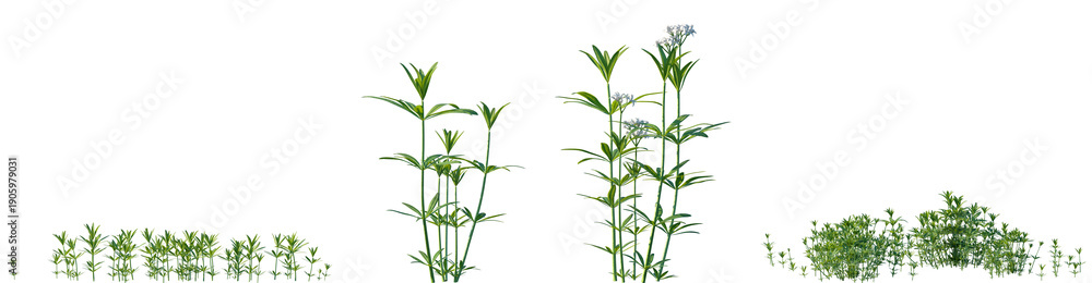 Set of Galium odoratum (the sweet woodruff, sweetscented bedstraw) flowering frontal isolated png on a transparent background perfectly cutout #1905979031