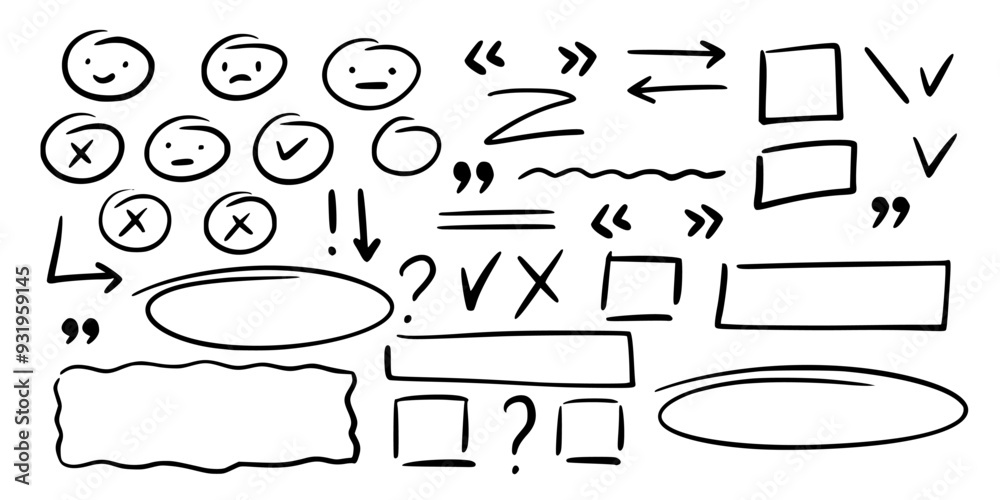 Set of graphic black elements of scribbles, notes, underlines, frames, highlights, accents, emotions on margins of summary, text document. Vector hand-drawn illustration on an isolated background. #931959145