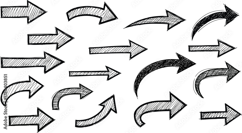 set of hand drawn abstract distress grunge brush arrows, set of black and white silhouettes of various brushed strokes, Hand-drawn collection of various arrow and brush set. #1780403851