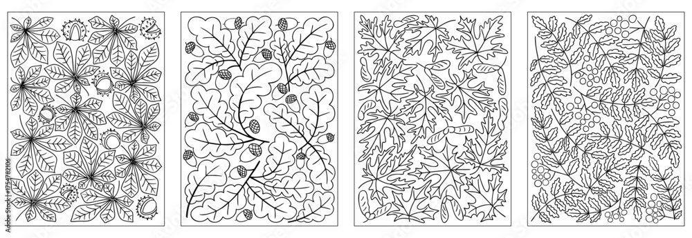 Set of hand drawn autumn coloring pages with chestnut, oak, maple, and rowan leaves, acorns, and berries. Concept of fall season, relaxation, nature illustration, and coloring activity #1754782106