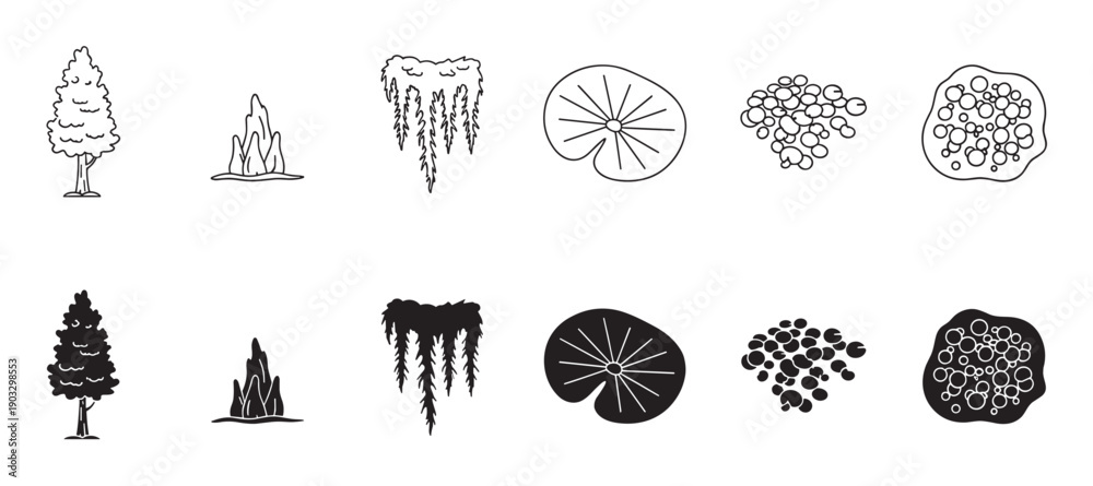 Set of hand-drawn swamp nature icons in outline and silhouette styles showing a cypress tree, reeds, hanging moss, a lily pad, and frog spawn for ecological design #1903298553