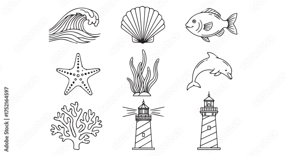 Set of handdrawn marine life and coastal elements icons isolated on transparent background #1752164597