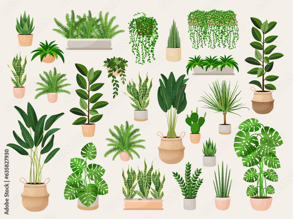 Set of houseplants in a pots for home, office, premises decor. Colorful vector collection of illustrations isolated on white background. Trendy home decor with plants, urban jungle. #635827930