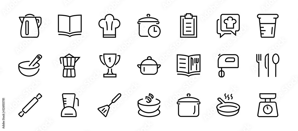 Set of icons for cooking and kitchen, vector lines, contains icons such as a knife, saucepan, boiling time, mixer, scales, recipe book. Editable stroke, perfect 480x480 pixels, white background #326103781