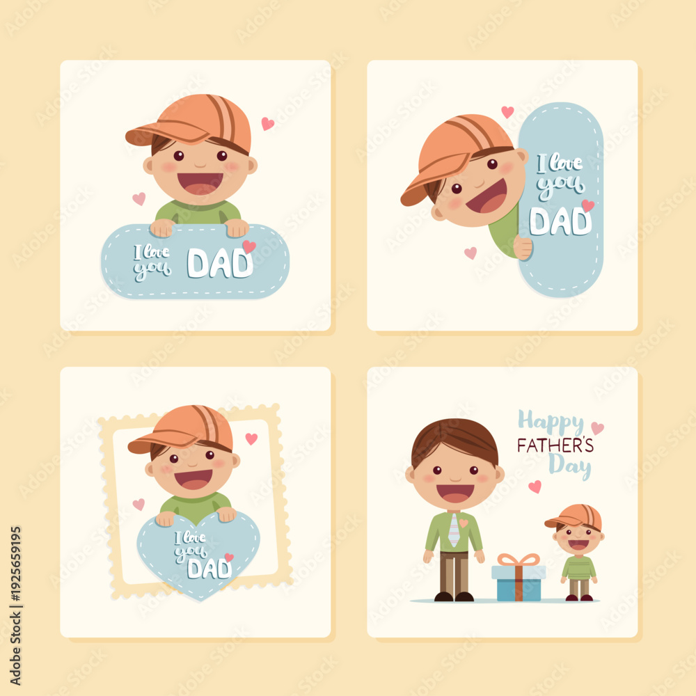 Set of illustrations of a boy congratulating his father on Fathers Day #1925659195