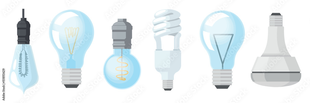 Set of light bulbs, lighting devices in cartoon style. Vector illustration of modern light bulbs of different shapes and sizes: fluorescent, LED isolated on white background. Energy-saving lamps. #1518113629