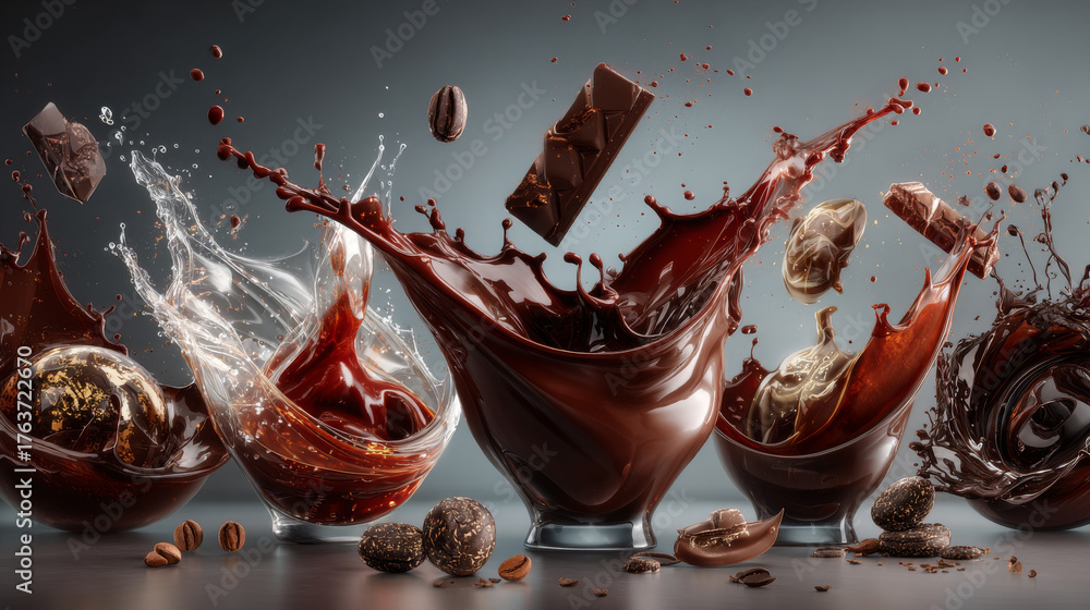 Set of liquid brown chocolate splashes, drops, blobs, drips. Hand drawn isolated elements, silhouette on white background for advertising, banner, menu in flat style. Vector EPS10 #1763722670