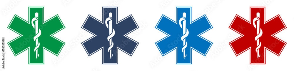 Set of medical emergency star of life symbols in green, navy, blue and red colors. Vector illustration showing healthcare and ambulance icons for hospital, clinic and emergency service designs. #1760829381